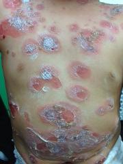 乾燥化が著明で、皮膚に唐傘模様のような発疹が集中して見られています。