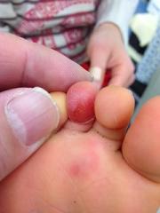 この赤ちゃんは、足の指全てが、しもやけで赤く腫れて見られています。
