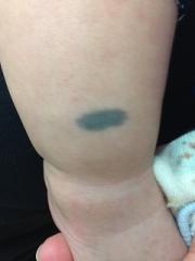 お子さんの足に見られた典型的な青色母斑の発疹です。
